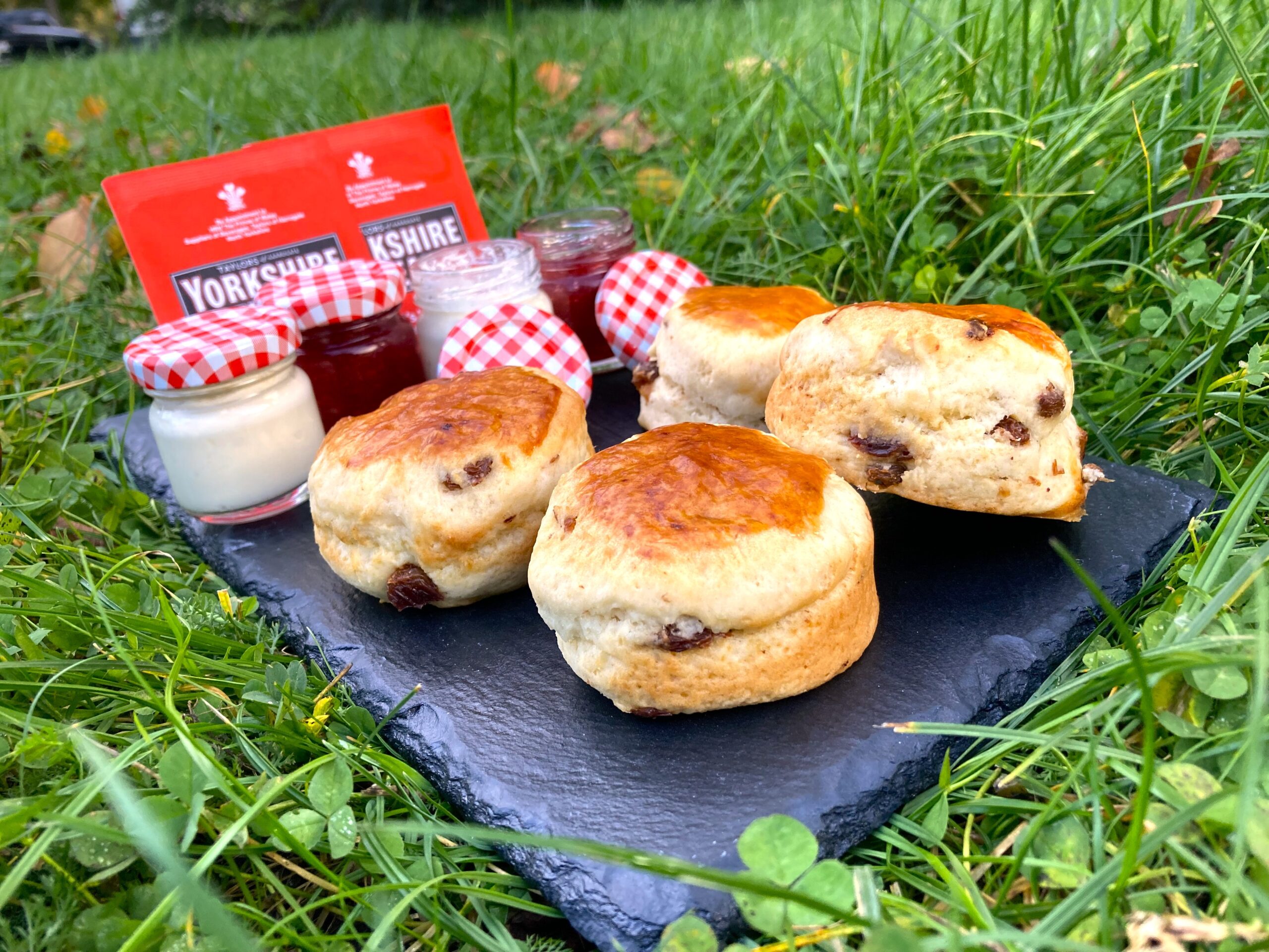 Inhalt: 4 Scones mit Rosinen, Original Clotted Cream, Erdbeermarmelade, Tee